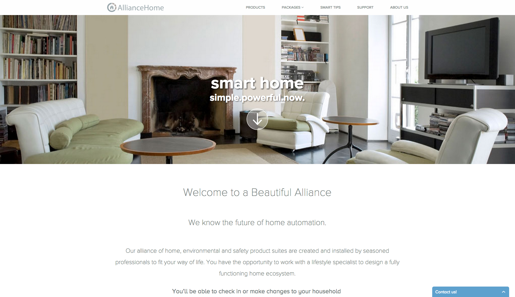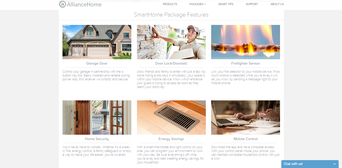 Sections include an introduction to Alliance Home, Products, Packages, Smart Tips, Support and About Us pages.